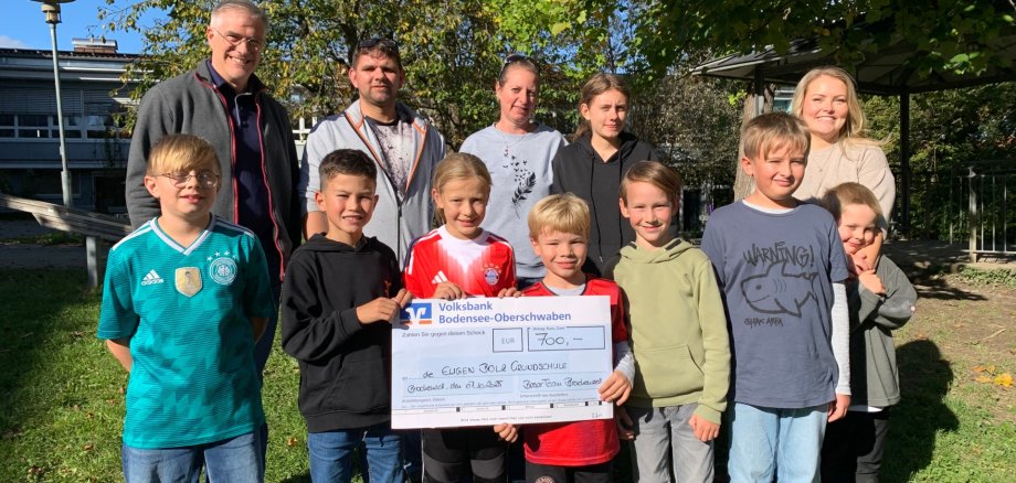 Bildunterschrift: Familie Vonbach mit den Eltern Richard und Silke sowie den Kindern Sofie (2., 3. und 4. v.l.) und Sebe (vorne ganz links) und Johanna Jani mit Felix (hintere Reihe ganz rechts) übergaben kürzlich Schulrektor Lothar Derkorn (links hinten) eine Spende von 700 Euro für den Schulförderverein der Eugen-Bolz Grundschule.