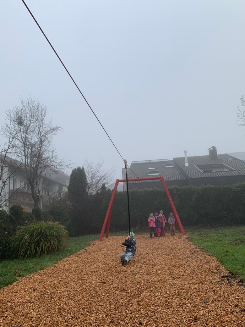 Bereits Ende Oktober wurden die neuen Stahlpfosten der Seilbahn einbetoniert. Nachdem der Beton rund drei Wochen ausgehärtet war, konnte das Tragseil montiert werden. Anschließend haben Kollegen vom Bauhof Meckenbeuren den notwendigen Fallschutz eingebracht: mehrere Tonnen Hackschnitzel sorgen nun für eine sichere Landung am Ende der Fahrt.