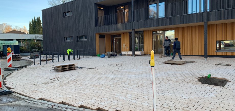 Vor der KiTa wird gepflastert, die Außenanlagen instandgesetzt und die Fahrradständer montiert. Auch ein Baum wird bald gepflanzt.