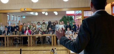 Rund 200 junge Musikerinnen und Musiker proben während der Herbstferien für ein internationales Musikprojekt in Meckenbeuren und Meersburg. Im Rahmen dieses kulturellen Austauschs begrüßte Bürgermeister Georg Schellinger am Dienstag eine Delegation von etwa 60 Gästen aus Riga (Lettland), Bursa (Türkei), Rathenow und Meckenbeuren im großen Sitzungssaal des Rathauses.