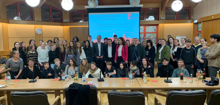 Rund 200 junge Musikerinnen und Musiker proben während der Herbstferien für ein internationales Musikprojekt in Meckenbeuren und Meersburg. Im Rahmen dieses kulturellen Austauschs begrüßte Bürgermeister Georg Schellinger am Dienstag eine Delegation von etwa 60 Gästen aus Riga (Lettland), Bursa (Türkei), Rathenow und Meckenbeuren im großen Sitzungssaal des Rathauses.