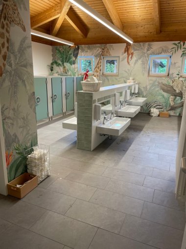 Zehn neue Kinder-WCs wurden eingebaut, drei für kleinere Kinder, dazu Waschbecken in drei verschiedenen Höhen und eine Dusche. Natürlich genießt jedes Kind Privatsphäre in einer eigenen Kabine. Auch die Fliesen wurden erneuert und die Wände in freundlichen Farben gestrichen. Jetzt strahlen die Sanitärräume mit den kleinen und größeren Besuchern um die Wette.