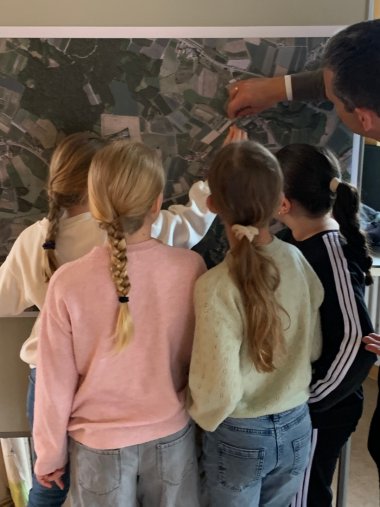 Am Ortsplan markierten die Mädchen und Jungen gemeinsam mit dem Bürgermeister Plätze, an denen sie sich gern aufhalten, wo ihre Freunde wohnen oder die schönste Wiese zum Beobachten von Milanen liegt.