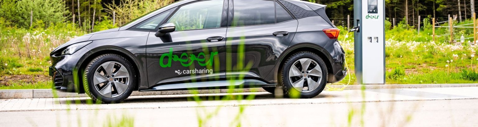 Am Bahnhof Meckenbeuren finden Interessierte den E-Carsharing- Standort der Firma deer mit Ladesäule. Jede Fahrt mit einem der 1102 E-Fahrzeuge im Stunden-, Tages- oder Wochenend-Tarif kann innerhalb des Mobilitätsnetzes in Baden-Württemberg, Bayern, Rheinland-Pfalz und Hessen an jeder der 803 Ladepunkte an mehr als 345 Standorten beginnen und enden.