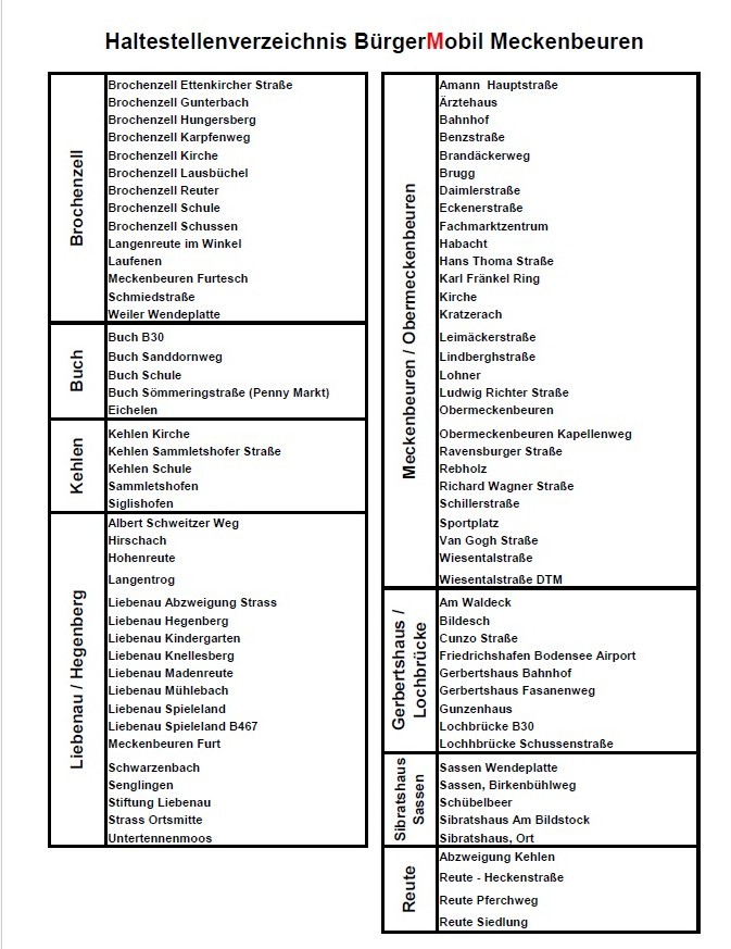 Im Haltestellenverzeichnis (s. Flyer Bürgermobil) sind alle 75 Haltestellen im Gemeindegebiet aufgelistet.